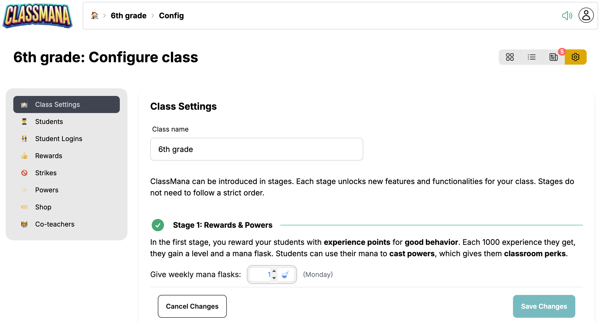 Stig 1 er grunnur leikræningarkerfi ClassMana. Þú verðlaunar nemendur með reynslustiga fyrir góða hegðun. Fyrir hverja 1000 reynslu sem þeir fá, hækka þeir um stig og fá 1 töfra. Nemendur geta notað töfra sína til að kasta krafti - sérstök fríðindi og forréttindi í kennslustofunni.
